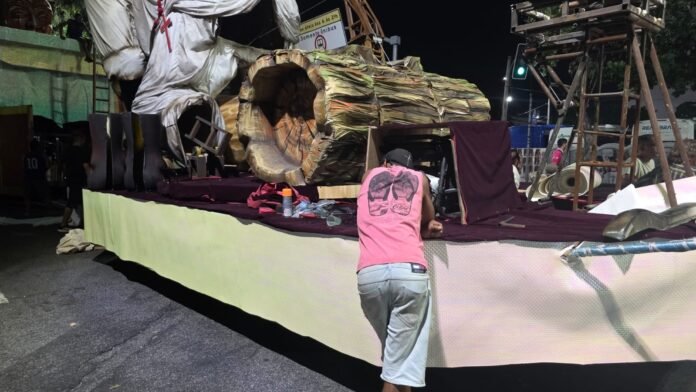 Primeira escola a abrir o carnaval 2026 na Marquês de Sapucaí, a Unidos do Jacarezinho, da Série Ouro, corre contra o tempo para finalizar as alegorias antes de entrar na avenida. Faltando meia hora para o início do desfile, integrantes da agremiação ainda colam tecidos no carro abre alas para esconder as madeiras das estruturas.