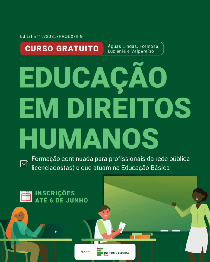 Estão abertas as inscrições para seleção de cursistas do curso de formação continuada em Direitos Humanos ofertado pelo Instituto Federal de Goiás (IFG), por meio da Pró-Reitoria de Extensão (Proex). Os interessados têm o até dia 6 de junho para se inscrever, exclusivamente pelo link: https://forms.gle/HJPvBvruV5g1noap9.