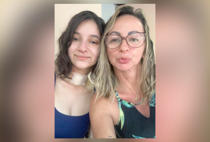 Em tom leve, Jaderluce Anísio de Oliveira, também comentou sobre a mudança no visual da filha: “De cabelo curto para essa nova fase”, já que Alana precisou cortar o cabelo durante o tratamento. Na publicação, feita no Instagram, mãe e filha aparecem juntas na imagem. Alana tem pontos visíveis no nariz, no queixo e no pescoço, marcas do ataque que quase tirou sua vida.