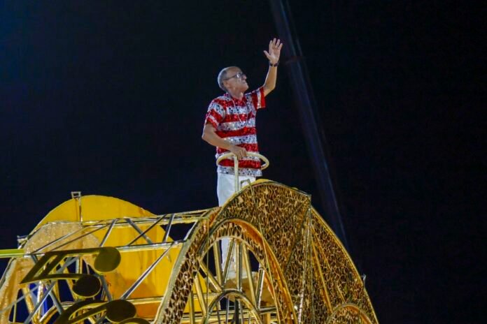 Além da bateria — que subiu no carro ao deixar o primeiro recuo e por ali permaneceu até o fim do desfile — a apresentação sobre a alegoria contou ainda com a companhia da rainha Juliana Paes, o intérprete Wander Pires (acompanhado de toda a equipe musical da escola), da diretoria e de dirigentes, como o presidente de honra Marcelo Calil e seu filho, Marcelinho Calil, totalizando 301 ocupantes. Esse momento foi muito aplaudido pelo público, que puxou o coro de “É campeã” em diferentes partes da Sapucaí, para a felicidade do carnavalesco Tarcísio Zanon, que, assim como Ciça, desfilou à frente e ao fim do desfile.
