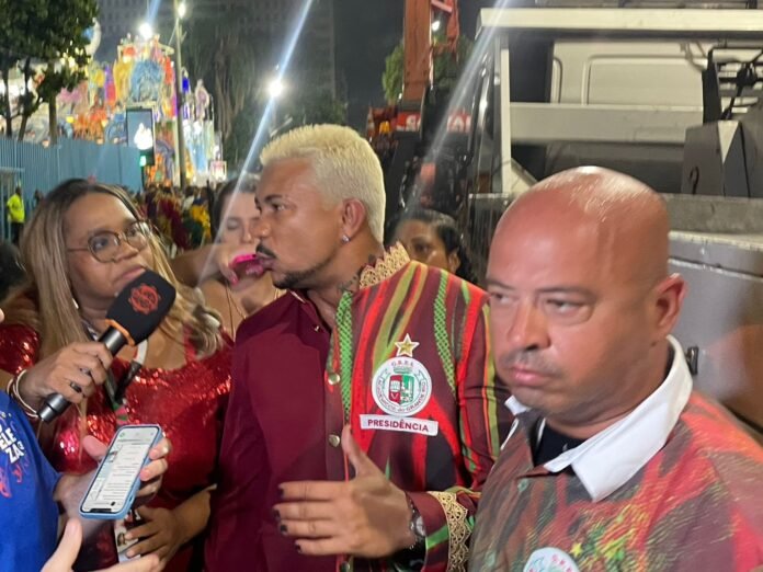 Com o traje alinhado ao padrão da ala e unhas pintadas de preto, Xamã chamou atenção logo na chegada. Antes de seguir para os ajustes finais, ele cumprimentou a musa Adriana Bombom, a Bombom, que também desfila pela Grande Rio neste ano. Os dois trocaram abraços e palavras rápidas em meio à movimentação intensa da concentração.