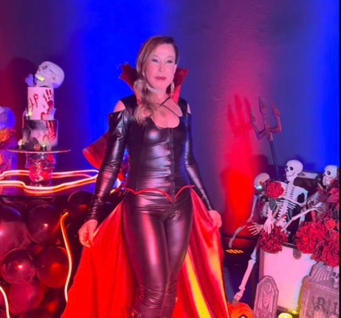 Aos 66 anos, a ex-mulher de Zezé Di Camargo se vestiu de Vampira sexy”, usando um roupa de couro justa e decotada.